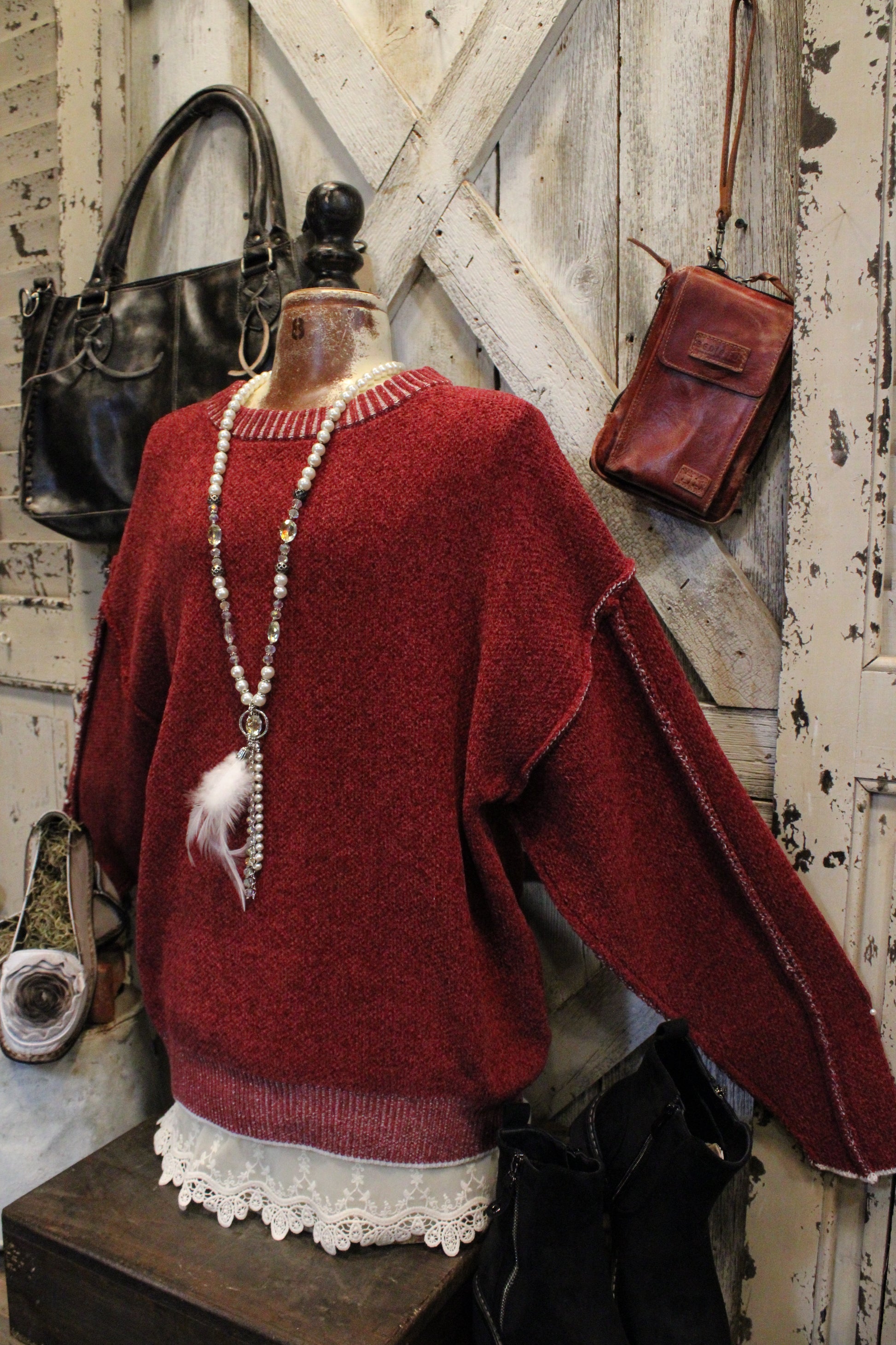 Introducing the Woven Beauty Cabernet Sweater - This sweater is the perfect blend of cozy comfort and rich, fall-ready style. Its soft knit texture and relaxed fit make it easy to wear, while the deep wine-red hue adds a touch of warmth and sophistication to your wardrobe.