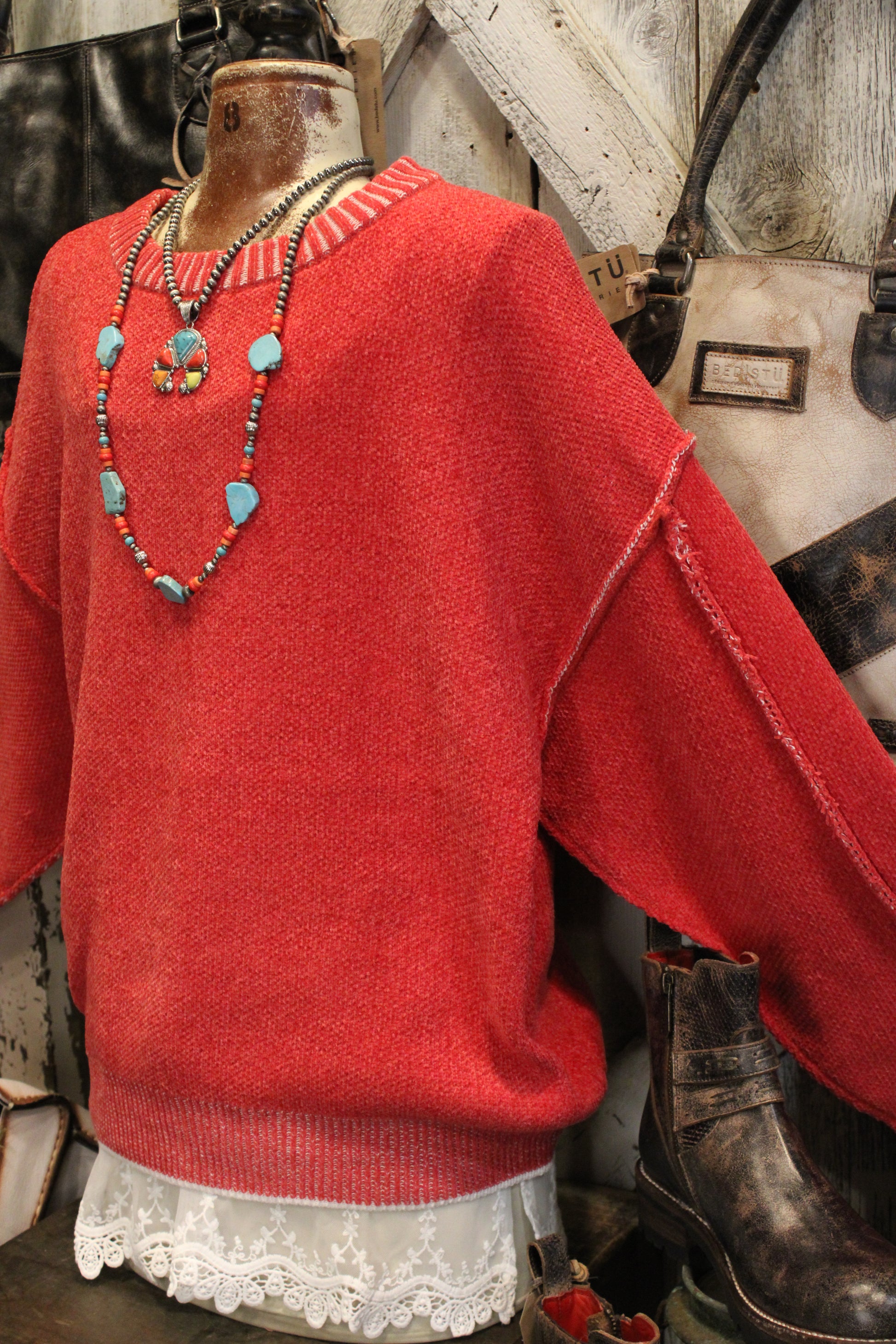 Introducing our Woven Beauty Dark Red Sweater- Snuggle up in style with this relaxed-fit red sweater that’s as comfy as it is cute. Designed with wide sleeves, a slouchy silhouette, and raw edge seam details, it brings that perfectly undone, cozy look we all love. The ribbed neckline with subtle stripe trim adds a touch of playful detail, while the longer length pairs beautifully with lace trims, leggings, or your favorite denim.