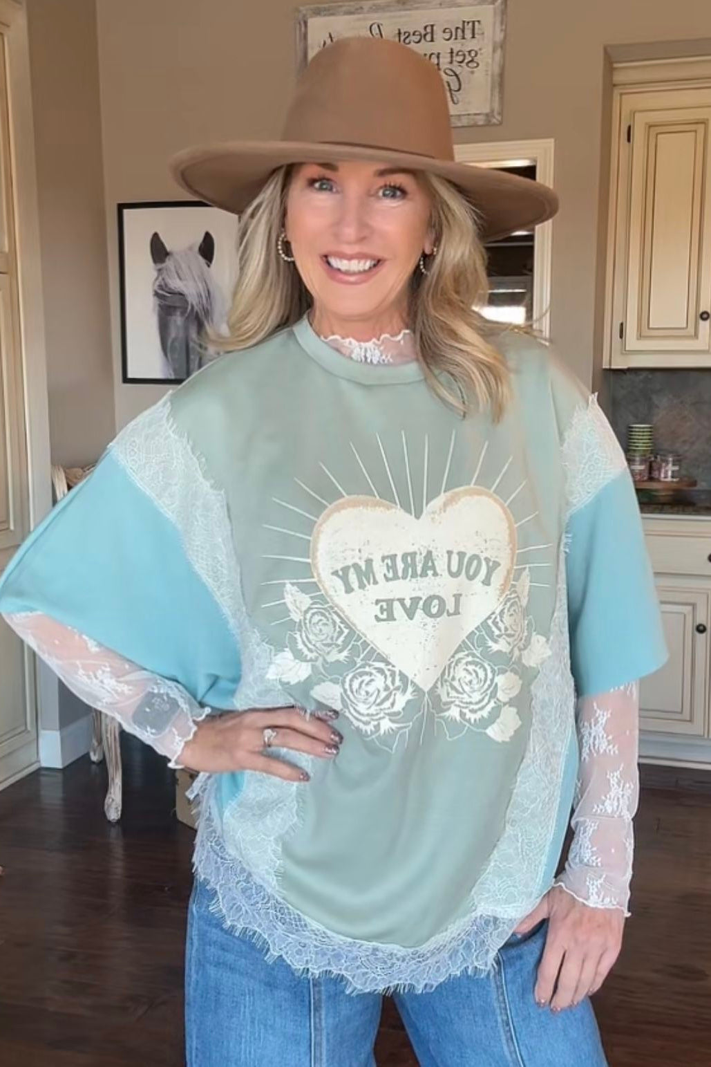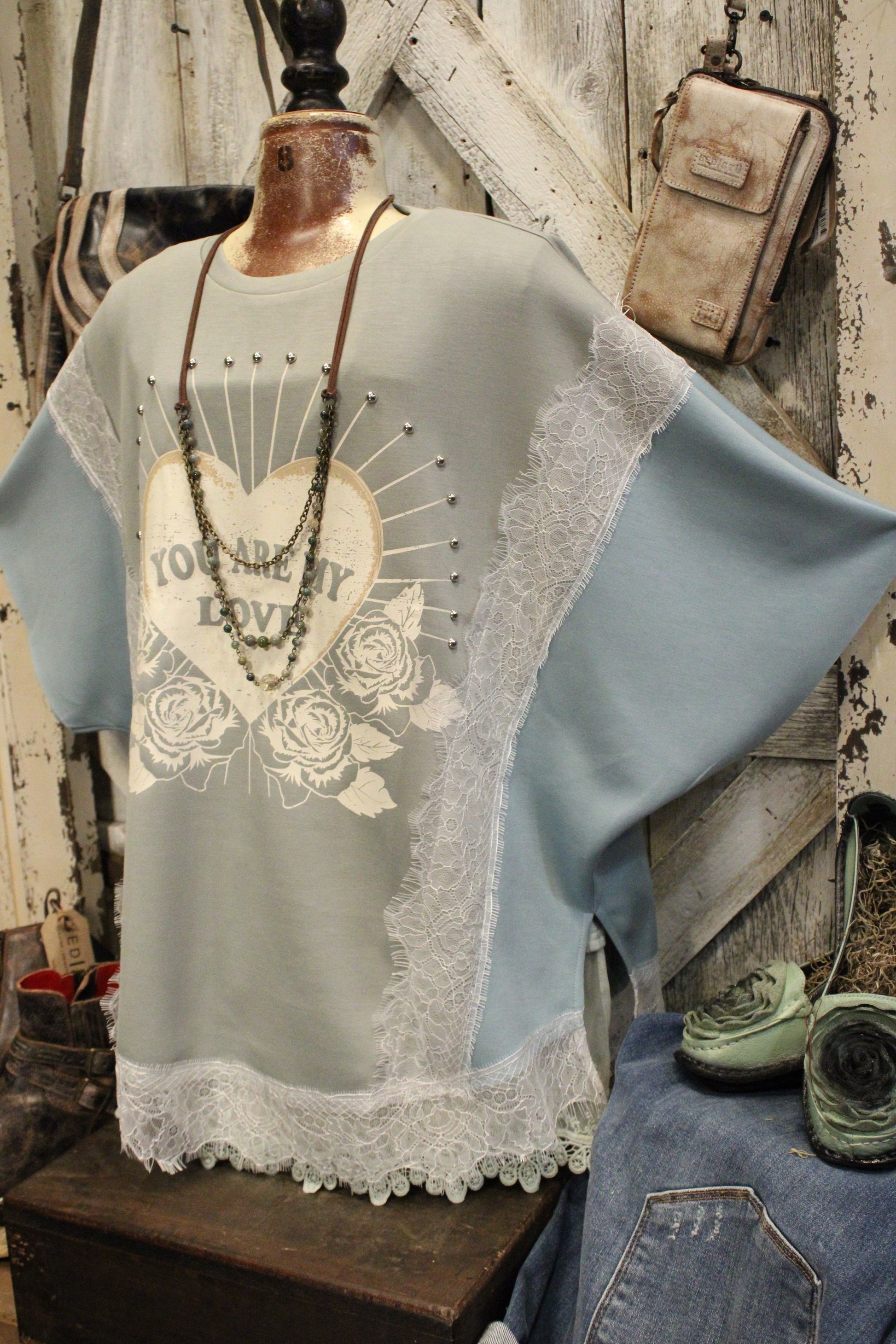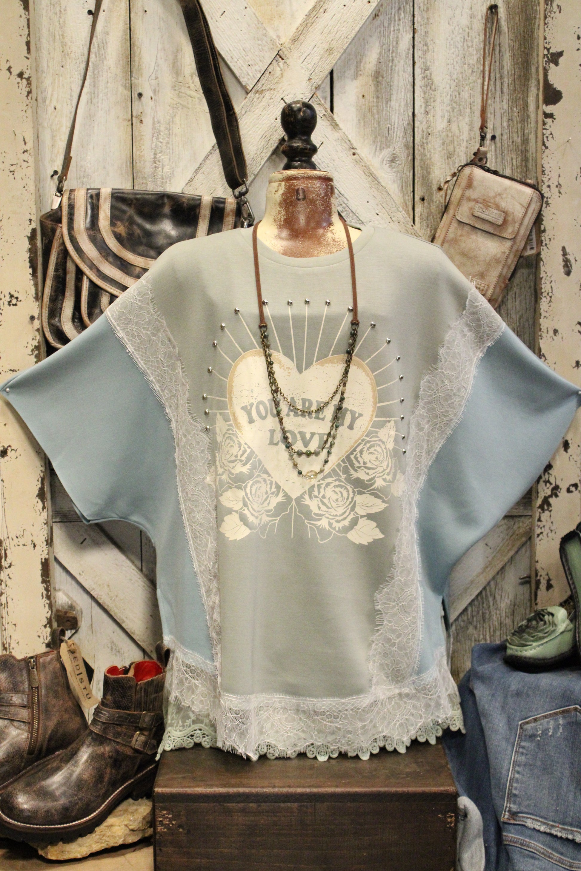 Introducing the You Are My Love Top- Sweet, dreamy, and overflowing with charm — this gorgeous top is ready to steal your heart! With its soft sage and teal color-block design, feminine lace accents, and the sweetest vintage heart graphic, this tee brings together everything we love about romantic, boho-farmgirl style.